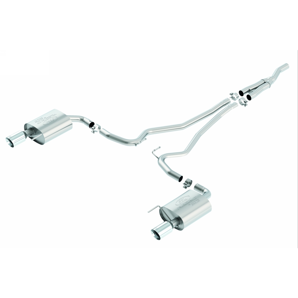 This cat-back exhaust system with integral Y-pipe bolts directly to the stock factory catalytic converter, making your Mustang 100% emission compliant while providing an aggressive muscle car sound. The tuned stainless steel mufflers with 4" chrome-plated stainless steel tips not only sound great but look great too.
